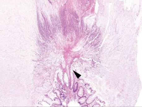 Figure 4.87 Pseudomembranous pattern. A dramatic (and beautiful) example of an eruptive pseudomembrane. The extensive fibroinflammatory debris appears to erupt from a single crypt (arrowhead).