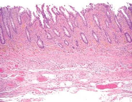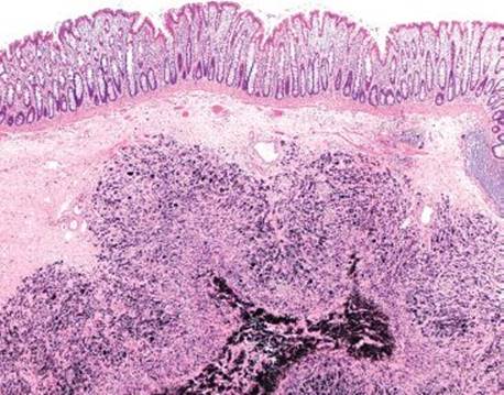 Figure 4.242 Tattoo. This case features tattoo pigment free-floating in the submucosa. The segmental resection occurred a few hours after the tattoo was applied (before a tissue response could be mounted).