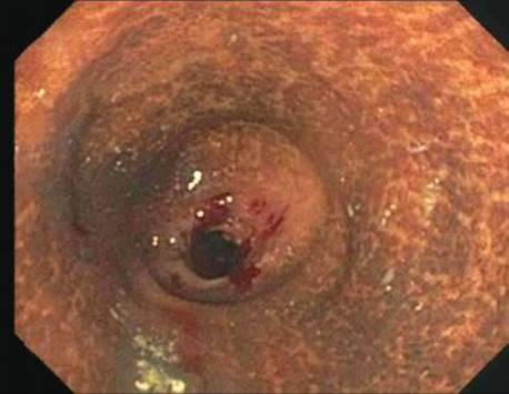 Figure 4.231 Melanosis coli, endoscopic image. This endoscopic image shows striking mucosal pigment deposition. This patient had a 10-year history of senna intake for chronic constipation.