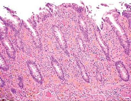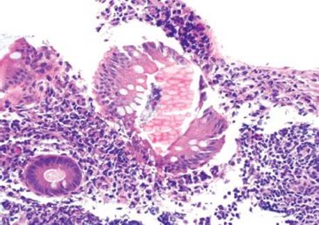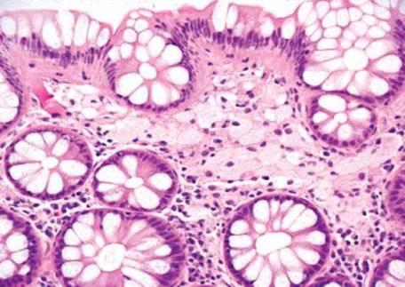 Figure 4.269 Muciphages. Higher power of previous case shows the muciphages streaming through the superficial lamina propria.