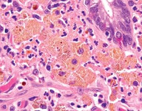 To those unfamiliar with muciphages, they can appear alarming at first. An interesting consultation case featured a prostate biopsy accompanied by bystander rectal tissue with prominent muciphages. The muciphages had become dislodged and “squished” and raised concerns for signet ring cell carcinoma. Helpful diagnostic clues include that the muciphages display bland cytologic features, immunolabel with the histiocytic marker CD68, and are cytokeratin nonreactive.