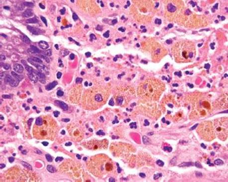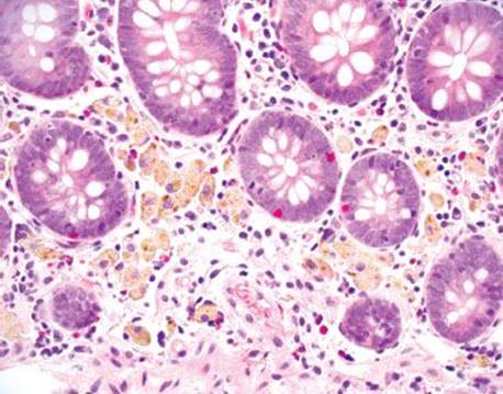 Figure 4.232 Melanosis coli. The characteristic brown-black pigment is within the cytoplasm of macrophages. The pigment is lipofuscin, not melanin.