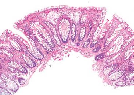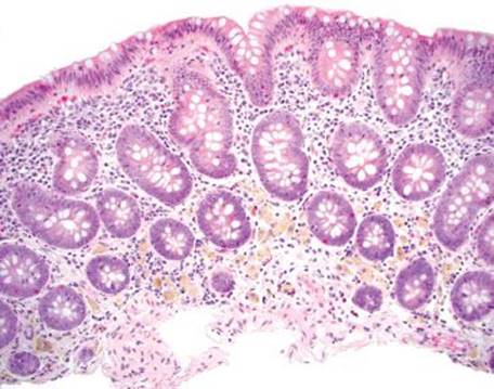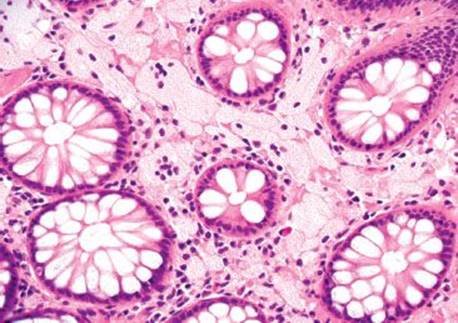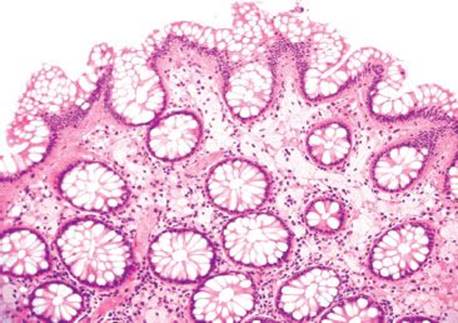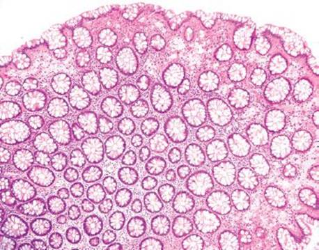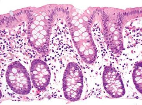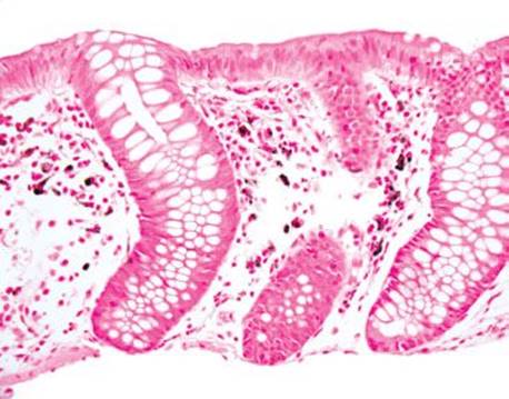 Figure 4.266 Muciphages. This low-power image shows the characteristic distribution of muciphages as they decorate the superficial lamina propria.