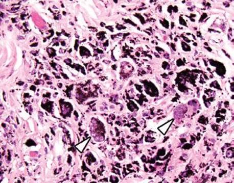 Figure 4.240 Tattoo. India ink remains the most widely employed tattoo agent. Note the black, coarse cytoplasmic globules within the macrophages. This exuberant case has elicited a foreign body giant cell reaction (arrowheads).