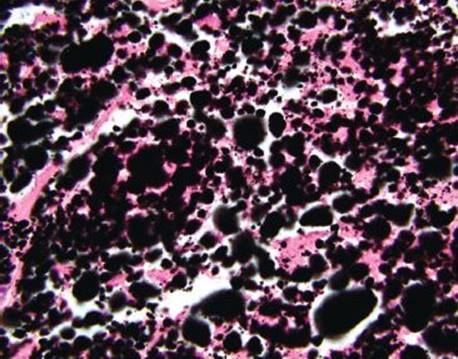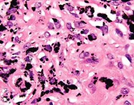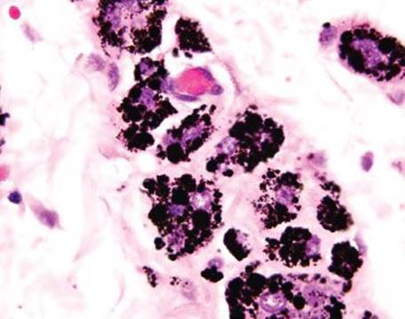 Figure 4.241 Tattoo. Under oil immersion, the coarse, globular nature of the black tattoo pigment is apparent. Note the bland nuclear features of the host macrophages that display perfectly round nuclei and delicate nucleoli.