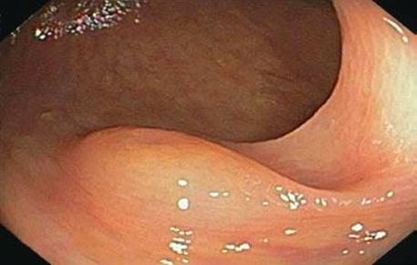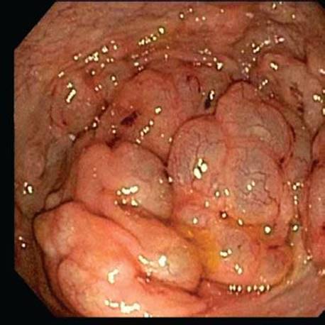 Figure 4.257 PCI, endoscopic image. Corresponding endoscopic images of the bowel wall show numerous convoluted mucosal folds that appear almost cerebriform.