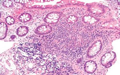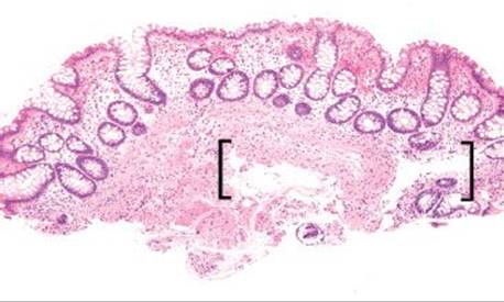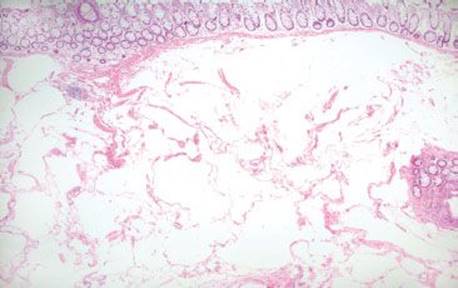 Pneumatosis cystoides intestinalis (PCI) refers to cyst-like structures impregnated with gas and lined by macrophages and foreign body giant cells. These structures are within the bowel wall and can be visualized endoscopically and radiographically (Figs. 4.256–4.262). Up to 85% of PCI cases are secondary to an iatrogenic procedure, mechanical, bacterial, metabolic, or pulmonary dysfunction.123 An association with collagen tissue disorders, AIDS, and glucorticoids has also been reported. While numerous theories of origin exist, the prevailing view is that increased intraluminal pressures force gas through damaged mucosa, and a subsequent tissue response manifests as a foreign body giant cell reaction. PCI can be seen anywhere along the tubular GIT, but most cases involve the bowel (colon = 78%, small bowel = 57%).123 Patients are usually asymptomatic. When pneumatosis is identified, it is important to assure that there is not other pathology in the resection that may have initiated the rather eye-catching pneumatosis&emdash;a classic example is scleroderma (which results in sclerosis of the muscularis propria and obstruction). CMV infection is also detected in some cases. Complications include obstruction, volvulus, intussception, ischemia, and perforation. Treatment is aimed at correcting the underlying disease or conservative medical therapy, where possible. See also, Pearls & Pitfalls, Granulomatous Pattern, this chapter.