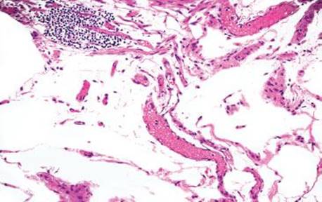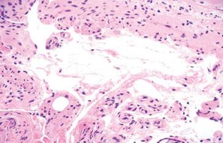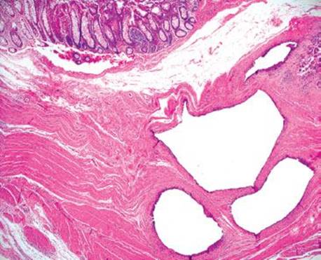 Figure 4.259 PCI. Histologic sections show multiple cyst-like spaces in the muscularis propria.