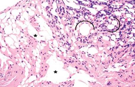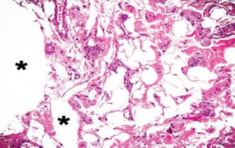Figure 4.248 Air artifact. An alternative field shows large, bizarre air pockets (asterisks), which dissect the resident tissue. Lipomas do not tend to percolate around native structures such as ganglion cell clusters, nerves, fibrous tissue, and blood vessels, as seen in this example of an air artifact. Also, there is no epithelial lining and no nuclei to suggest a lymphovascular space or adipocytic lesion, respectively.