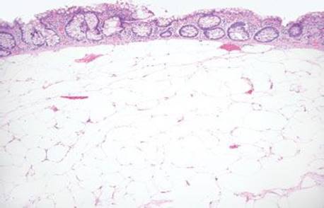 Endoscopy relies on air insufflation to expand the bowel for proper visualization. Through this process, increased intraluminal pressure can force air into the bowel wall. Cases without a concomitant foreign body tissue response are classified as air artifacts. Air artifacts are so extraordinarily common that our eyes often glide right over this finding. When the foci are small and the tissue is of nonpolypoid or flat mucosa, it is easy to dismiss these peculiar foci as air artifacts. Difficulties arise in the case of subtle polyps for which the diagnostic dilemma is air artifact versus lipoma. Deeper sections and endoscopic correlation can often clarify the issue. Lipomas display a characteristic “pillow” sign when compressed (Figs. 4.244 and 4.245). Histologic clues can be a bit subjective and frustrating. In contrast to a lipoma, air artifact gently pushes apart the neighboring cellular constituents so that inflammatory and stromal cells as well as vascular and neural structures are seen coursing between the empty spaces. Additional helpful clues include a lack of nuclei within the empty spaces (in contrast to an adipocyte with a bona fide nucleus) and that the sizes and shapes of the empty spaces can be unnaturally large and bizarre (Figs. 4.246–4.252). In contrast, lipomas have minimal intervening cellular components, clearly discernible nuclei, and the cytoplasm is more predictably uniform in size and shape (Figs. 4.253 and 4.254). Note, well-differentiated liposarcomas violate these general tips, but they would present as large mass lesions for which air artifact would not enter in the differential diagnosis. In challenging cases, well-differentiated liposarcomas display MDM2 and CDK4 immunoreactivity (Fig. 4.255). Some cases of entrapped air form cyst-like spaces and illicit a tissue response. These findings are classified as pneumatosis cystoides intestinalis, see next subsection.