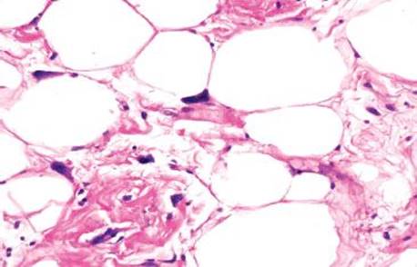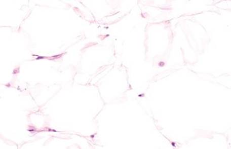 Figure 4.254 Lipoma. High power shows that each lipocyte has its own small, peripheral nucleus. Also the (benign) neoplastic cells have a uniform architecture with few intervening nonlipocytic elements. These key features of a lipoma contrast with findings in air artifacts.