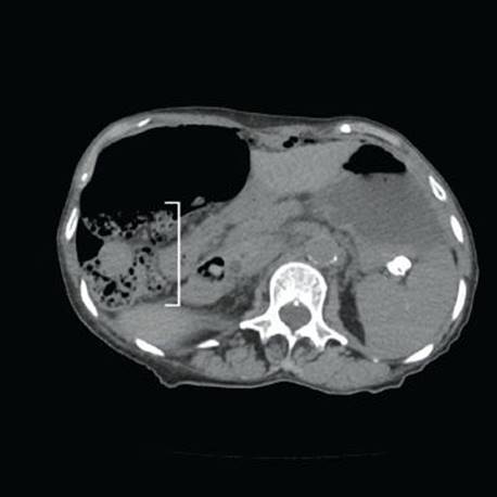 Figure 4.256 Pneumatosis cystoides intestinalis (PCI). This patient had a longstanding history of chronic obstructive pulmonary disease (COPD) and presented with abdominal pain. The imaging study shows numerous air pockets within the bowel wall. The bowel wall has a spongelike or swiss-cheese-like foamy appearance on imaging (bracket). COPD causes PCI secondary to increased intraabdominal pressure, which forces gas into the bowel wall.