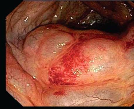 Figure 4.245 Lipoma, endoscopic image. However, upon compression, the “pillow sign” is seen. In this analogy, the instrument is a head and the polyp is its pillow. Note, how the “head” indents or displaces portions of the “pillow.” This endoscopic finding is highly suggestive of a lipoma.