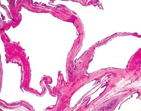 Figure 4.246 Air artifact. This resection case originated from a patient with bowel perforation. Note the large, billowing, cloudlike air pockets coursing through the submucosa. Although subtle cases of air artifact often raise the possibility of a lipoma, these particular air pockets are far too large, bizarre, and convoluted to be anything other than entrapped air.