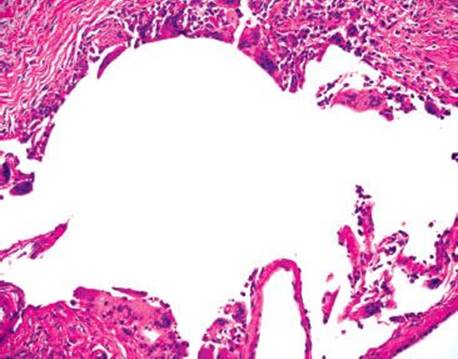 Figure 4.247 Air artifact. Higher power shows the air pockets are pushing apart the normal cellular constituents (note the lymphoid aggregate in the upper left, vessels in the middle, and ganglion cells in the upper right). In addition, the air pockets have no endothelial lining (to suggest a lymphovascular space) or nuclei (to suggest an adipocyte), both helpful clues to the diagnosis of air artifact. Also, note there is no tissue response (there are no foreign body giant cells reacting to the displaced gas). This emergent bowel resection occurred almost immediately after the perforation, before the tissue had sufficient time to react to the infiltrating gas.