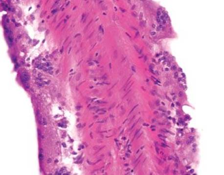 Figure 4.270 Medication resin, sevelamer. Sevelamer resins show broad, irregular “fish-scales” with curvilinear points of intersection and a two-tone coloration on H&E, as in this example.