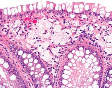 Figure 4.264 Muciphages are mucoprotein-containing macrophages that accumulate secondary to prior rectal injury.