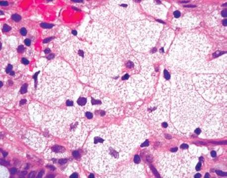 Figure 4.265 Muciphages. Under oil magnification, the bland nuclear features are seen. Dislodged muciphages can occasionally raise concerns for signet ring cell carcinoma. Helpful clues to the diagnosis of benign muciphages include the bland cytology and lack of background dysplasia and desmoplasia. In difficult cases, CD68 will confirm their histiocytic origin. Muciphages are cytokeratin nonreactive.