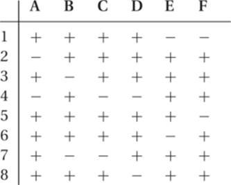 21. The deletion map below shows eight deletions along a chromosome. Six (A–F) point mutations were tested against these eight deletions for their ability to complement. A plus (+) corresponds to complementation while (−) indicates a lack of complementation. Determine the order of the genes on the chromosome.