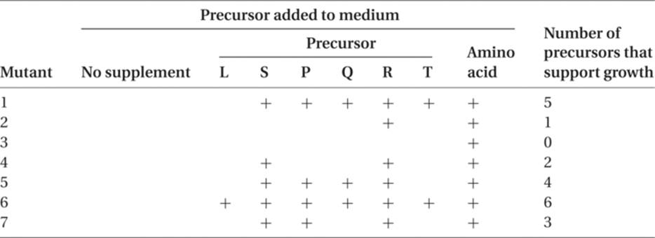 Returning to the original problem, R, the intermediate used by six of the mutants, is probably just before the amino acid, and the mutant that cannot grow if given R is probably blocked between R and the amino acid. This is mutant 3. Intermediate S can support growth of five mutants and is probably the immediate precursor of R. It cannot be used by mutant 3 or by mutant 2; this tells us that mutant 2 blocks between S and R. The next most frequently used intermediate is P, which is unable to support the growth of mutants 2, 3, and 4. We can conclude, therefore, that the sequence, to this point, is