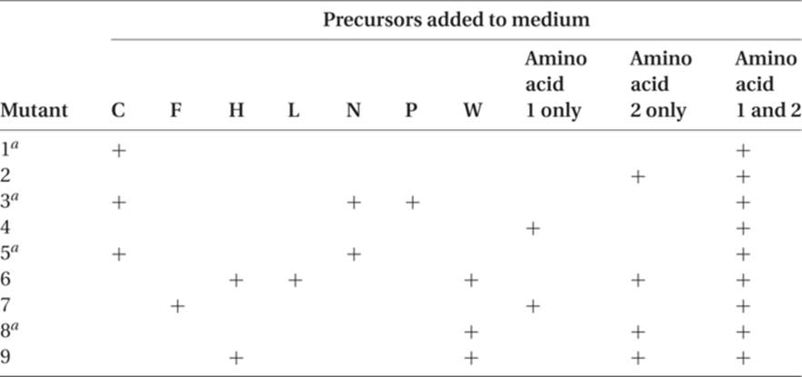 If we look at mutant 6, it obviously cannot be benefited by addition of any of the precursors, since it can make all of them but cannot carry out the last step in the synthesis. We can conclude, therefore, that the smaller the number of intermediates that will permit growth, the closer that mutant gene is to the end of the synthetic pathway. The greater the number of intermediates that will permit growth, the further “upstream” that gene is functioning.