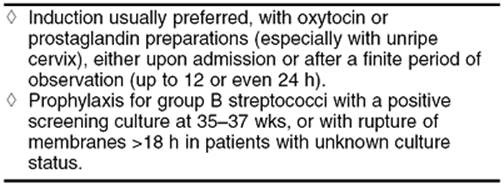 · At or near term (35 weeks) induction is usually preferred; GBS prophylaxis is given with a positive screening culture at 35 to 37 weeks or with rupture of membranes greater than 18 hours plus an unknown culture status.