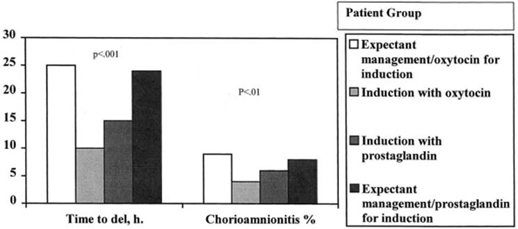 A large meta-analysis involving 23 studies and including nearly 7,500 patients concluded that conservative management may result in more maternal infections than immediate induction with either oxytocin or prostaglandins. This meta-analysis also showed that the rate of chorioamnionitis was higher in patients induced with prostaglandin versus those induced with oxytocin. However, this meta-analysis was heavily influenced by the large international trial, and as noted previously, this trial used a very low dose of prostaglandin.