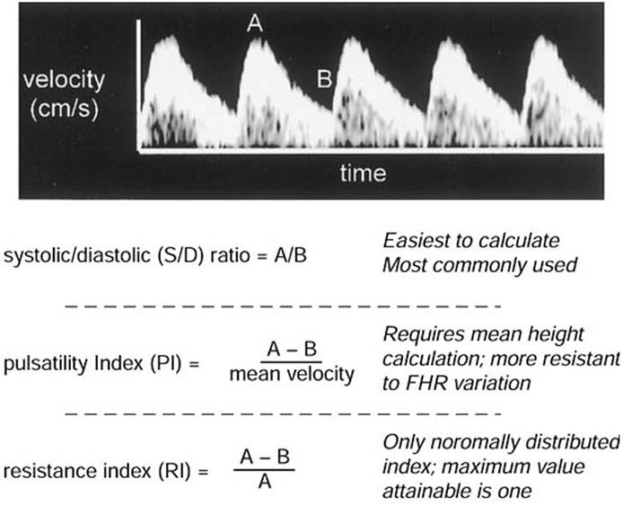 The concept of Doppler, which is used in ultrasound, is named after Johann Christian Doppler. The Doppler concept refers to energy that is reflected from a moving boundary, and how the frequency of the reflected energy varies in relation to the moving boundary. In ultrasound terms, Doppler depends on the ability of an ultrasound beam to be changed in frequency when encountering a moving object (red blood cells). After cosmetic manipulation, a waveform is generated that has a clear systolic and diastolic component. Although resistance to blood flow in a given interrogated vessel in the fetus cannot be directly measured, it is possible from the waveform to obtain an index of resistance. Figure 12.3 shows a FVW in the umbilical artery with clear systolic and diastolic cardiac components. Using the peak systolic and peak diastolic values, it is possible to generate Doppler indices of resistances. These include the systolic-to-diastolic (S/D) ratio, pulsatility index, and resistance index. Because these three indices are functions of the same variables, they are correlated highly with one another. The characteristics of these indices are also shown in Figure 12.3. The original continuous-wave Doppler technology has been replaced by pulsed-wave Doppler technology. Doppler velocimetry is useful in cases where the fetus is asymmetrically grown due to a uteroplacental etiology.