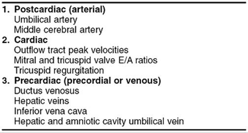 A convenient way to clinically approach the variety of fetal vessels that lend themselves to Doppler investigation is to conceptualize the progressive nature of the IUGR disease process and categorize them into three compartments related to the fetal heart: