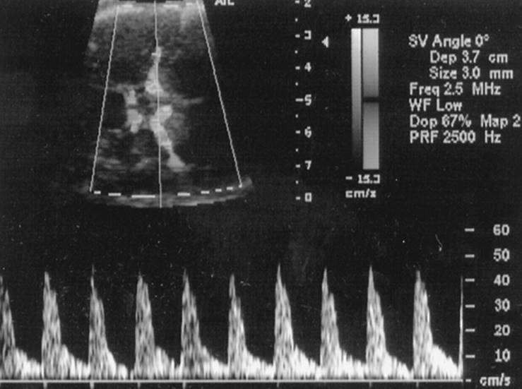 The precordial veins (ductus venosus, hepatic veins, IVC, umbilical and portal veins) have characteristic FVWs as shown by pulsed-wave Doppler velocimetry. The umbilical and portal veins have FVWs that are steady and without pulsations, while the other precordial “systemic” veins have FVWs that reflect the central venous pressures. The following information on the precordial venous FVWs is in reference to the hepatic vein, ductus venosus, and IVC, which have three characteristic phases during a single cardiac cycle. Ventricular systole induces the greatest pressure gradient between the right atrium and the precordial veins during the cardiac cycle. Thus, the blood traveling within these vessels to the heart will have the highest velocity during systole. This is referred to as the “S” component of the FVW. During early diastolic filling, the second highest velocity of blood through these venous conduits will occur and is referred to as either “D” or “e”. The lowest velocity of blood traveling through these vessels is in late diastole when the atria are contracting; this phase of the FVW is referred to as the “a”-wave. The a-wave in the ductus venosus remains in a positive direction (i.e., blood continues to move toward the heart even during the phase of lowest pressure gradient during atrial contraction). In contrast, the a-wave in the IVC and hepatic veins is in a negative direction indicating that blood is moving away from the heart. The difference in the a-waves between these vessels is important clinically because one can easily confuse reverse flow in the ductus venosus due to the close proximity of these vessels. However, the use of color Doppler and the identification of aliasing should easily distinguish the vessels.