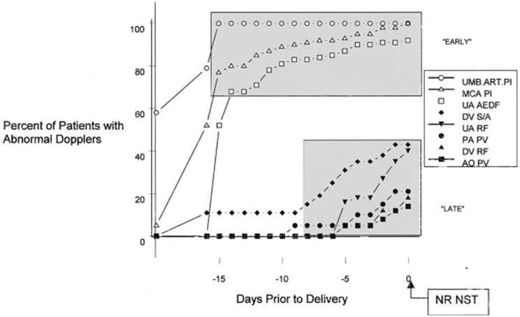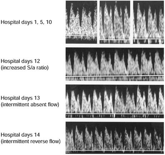 Over the past decade, numerous centers across the United States and in Europe have shed light on circulatory physiology in the normal and growth-restricted fetus. This has been approached by assessing FVWs in a number of different vessels in the fetus. While these reports provide useful information on any given vessel, reports on one or two vessels alone are not practical from the clinical standpoint since these were primarily cross-sectional studies and did not provide any information on the temporal nature of Doppler changes. After the turn of the 21st century, three reports appeared in the literature that combined longitudinal information on several different vessels with biophysical data obtained from the IUGR fetus. These studies showed that there are sequential changes in Doppler FVW-resistance measurements in different vessels of the severely growth-restricted fetus that is progressively deteriorating.