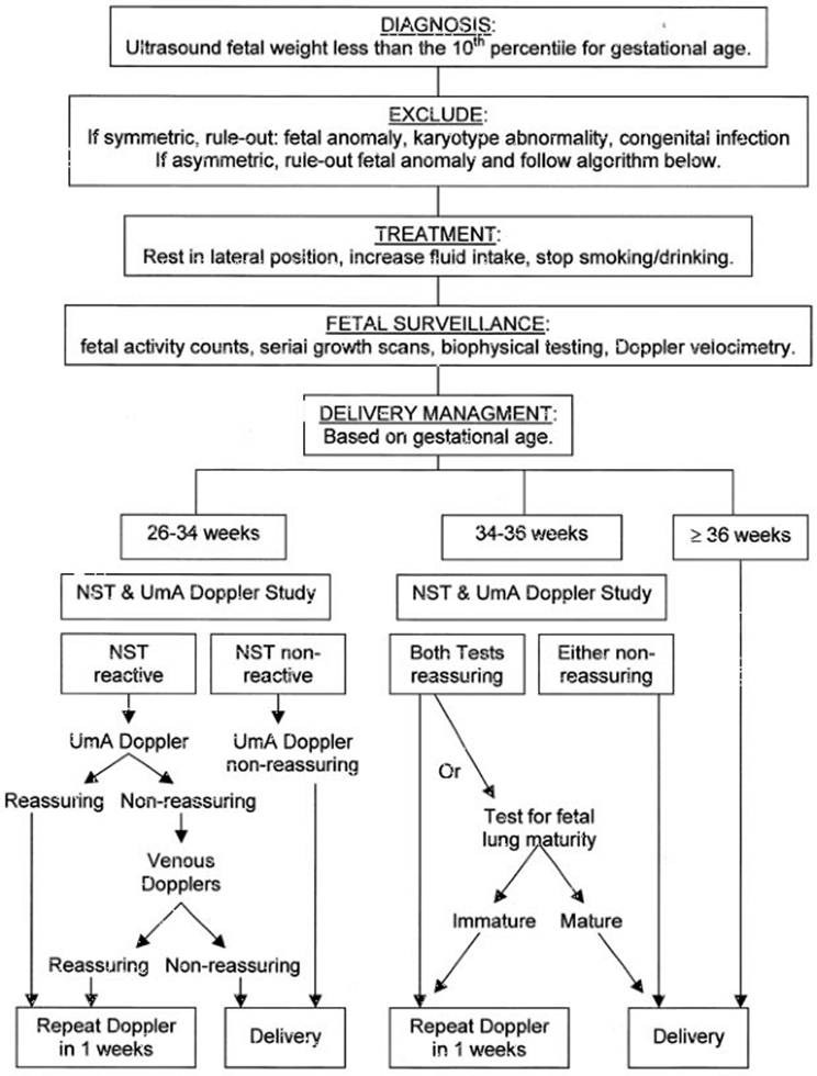FIG. 12.8. Algorithm for management guideline of the intrauterine growth restricted fetus. |