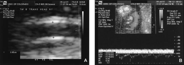 As mentioned earlier in this chapter, prolonged fetal hypoxia as a result of uteroplacental insufficiency will result in a redistribution of blood flow within the fetus in an attempt to deliver more oxygen by increasing volume blood flow to vital organs. This has been shown to be the case in some classic animal studies where prolonged hypoxia leads to blood flow redistribution that is favorable to the heart, brain, and adrenal glands. This redistribution has also been shown by pulsed-wave Doppler velocimetry to occur in human IUGR fetuses. The fetal brain normally has a high-resistance blood flow pattern, which is depicted by low flow velocity at end-diastole, relative to other organs and large vessels. During hypoxia, cerebral vascular autoregulation adjusts blood flow within the brain by decreasing the resistance to flow. The decrease in resistance can be easily detected by pulsed-wave Doppler, which provides an FVW profile that depicts an increase in end-diastolic flow velocity. This will in turn result in a calculated Doppler index of resistance that is low compared to the normally high resistance seen in the cerebral circulation. The most common cerebral artery used for Doppler assessment of the fetal brain-sparing effect is the MCA. The anatomic site and direction of the MCA is perpendicular to the cerebral midline (Fig. 12.4). This allows for the Doppler beam to be easily positioned along the midportion of the vessel with a minimal angle of insonation, thereby optimizing FVW acquisition. Incidentally, another advantage of the MCA position is that acquisition of a direct measurement of the absolute velocity in cases of fetal anemia (i.e., Rh isoimmunization and parvovirus) is easily obtained at this location.