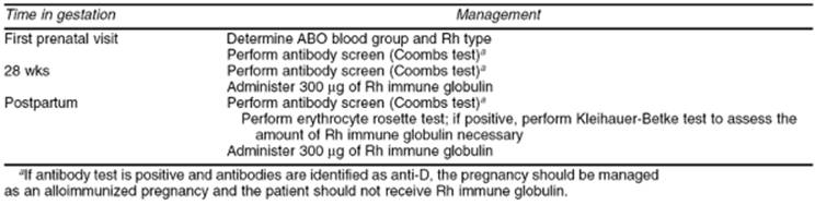 · Rh immunoglobulin should be given to Rh–negative, unsensitized women at 28 weeks gestation, within 72 hours after delivery, and in the event of antenatal procedures and complications associated with fetomaternal hemorrhage.
