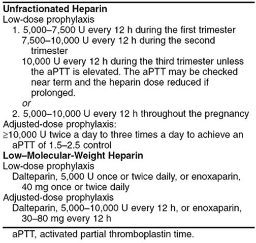 The safe and effective dose of heparin for pregnant women with APS is debated but should probably depend on individual patient history. Women with APS and a history of thromboembolism should receive adjusted-dose anticoagulation with unfractionated heparin or low–molecular-weight heparin during pregnancy (Table 18.10). For women with APS without a history of thromboembolic disease, the choice of anticoagulation is less clear. Low-dose heparin prophylaxis may be sufficient for women with recurrent first trimester loss and no history of fetal loss. However, women with a history of fetal death (>10 weeks gestation) may be at higher risk for thromboembolism during pregnancy and should probably receive higher doses of heparin prophylaxis. We treat such women with generous thromboprophylaxis (e.g., 15,000 to 20,000 units of standard heparin or 60 mg of enoxaparin in daily divided doses). Recommendations for postpartum therapy vary but most authorities recommend at least 6 weeks of some regimen of anticoagulation with unfractionated heparin, low–molecular-weight heparin, or warfarin.