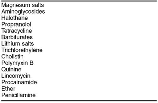 Careful plans should be made for drug therapy during pregnancy, labor, delivery, and the postpartum period. Some antibiotics such as the aminoglycosides may produce a myasthenic crisis and should be avoided. Other medications may also be harmful in women with MG (Table 18.11). Many patients with MG are sensitive to sedatives, analgesics, tranquilizers, and especially narcotics. Muscle relaxants should be avoided. Local or regional anesthetics are preferable. Magnesium sulfate is contraindicated because the drug diminishes the acetylcholine effect and has been known to induce a myasthenic crisis.