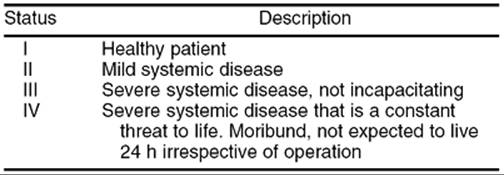 Although some office procedures can be performed without anesthesia, some will require oral or intravenous sedation. The term conscious sedation implies a state in which patients can tolerate procedures with adequate cardiopulmonary function and respond to verbal commands. The American Society of Anesthesiologists (ASA) has published guidelines for sedation and analgesia performed by medical staff not trained in the practice of anesthesia. In the office setting nonanesthesia residency–trained physicians should limit patients to ASA classification I or II (Table 27.1). The clinician should avoid procedures on patients with significant cardiac, respiratory, or neurologic disease in the office setting.