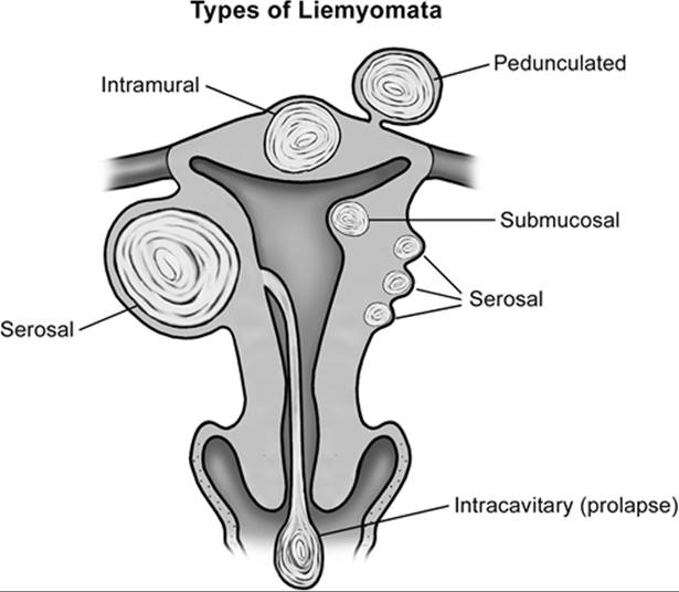 FIG. 49.1. Possible locations of leiomyomata. This schematic diagram illustrates the many locations at which leiomyomata may develop. Symptoms related to heavy vaginal bleeding generally are greater when the leiomyomata are in close proximity to the endometrial cavity, with serosal tumors that can attain large size with virtually no change in menstrual bleeding. Fibroids can develop anywhere in the uterus, with the cervix having proportionally fewer because of its lower complement of myometrial cells. |