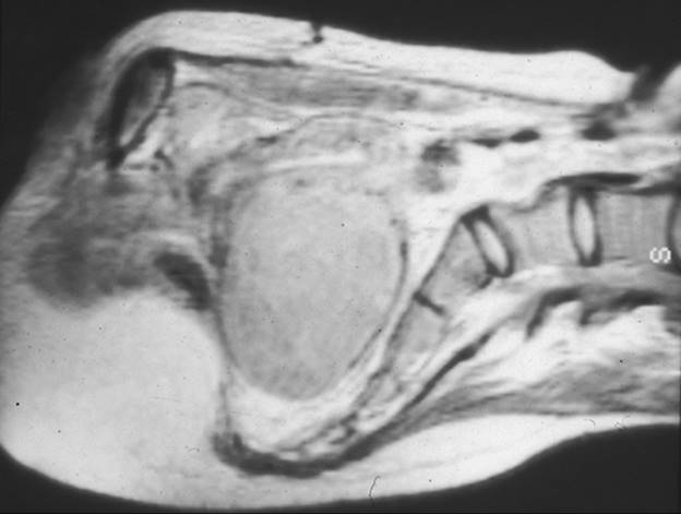 FIG. 49.2. Magnetic resonance imaging of leiomyomata. This magnetic resonance image demonstrates a large leiomyoma arising from the posterior aspect of the uterus and filling the entire pelvis. It directly contacts the promontory of the sacrum. |