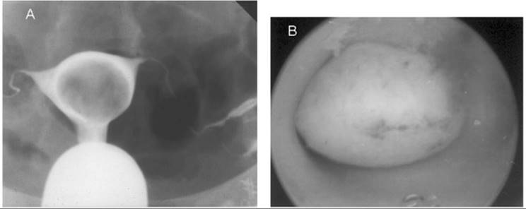 FIG. 49.3. An intracavitary leiomyoma. A: A hysterosalpingogram using a water-soluble contrast medium demonstrates a large, smooth filling defect within the endometrial cavity resulting from an intracavitary fibroid. The mass effect on the study is nonspecific, and only direct visualization can confirm that it is caused by a fibroid. B: The hysteroscopic view of this intracavitary leiomyoma. |