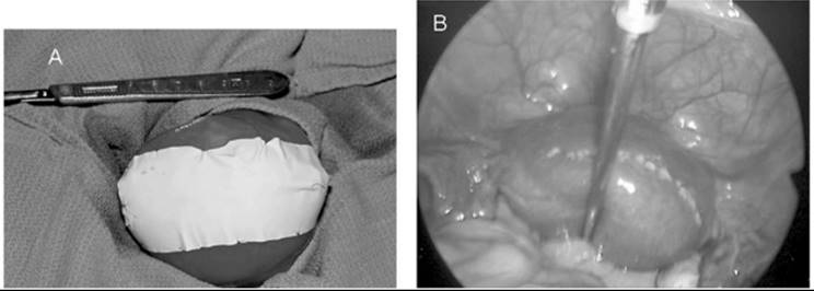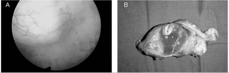 FIG. 49.4. Submucous leiomyoma. A: A submucous fibroid visualized at hysteroscopy is from a woman with a history of menometrorrhagia unresponsive to medical management with NSAIDs and oral contraceptives. Although the tumor protrudes into the endometrial cavity, most of it is still within the underlying myometrium. B: The hysterectomy specimen which demonstrates the submucous myoma responsible for the excessive vaginal bleeding. |