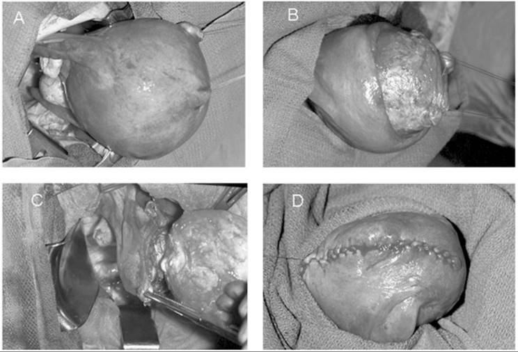 FIG. 49.5. Myomectomy. A: Surgical exposure of a large uterus containing an intramural leiomyoma is depicted. The fibroid is dissected from the underlying myometrium in (B). C: The uterine incision is extended down into the cavity and the fibroid is removed. The myometrium is reapproximated in layers (D) and the uterine muscle wall closed. |
