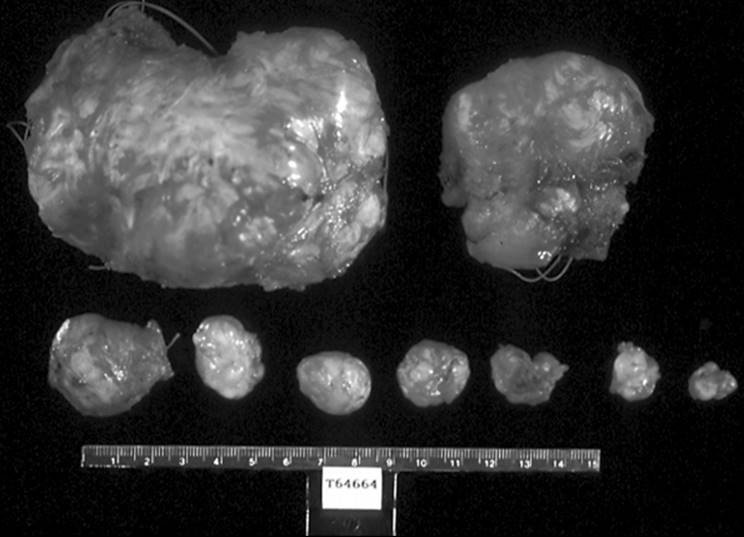 FIG. 49.7. Multiple leiomyomata excised at myomectomy. Many individual fibroids of different sizes and shapes can be encountered within the same patient. Some are very large and obvious, while others may be small and difficult to palpate. |