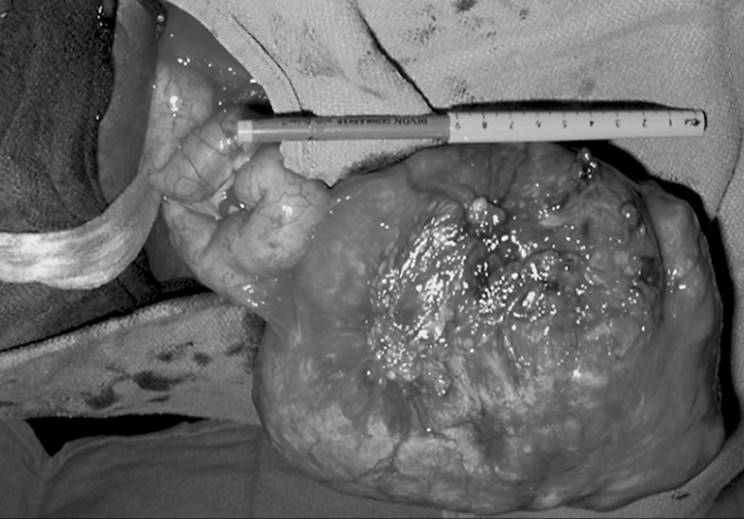 FIG. 49.6. A parasitic fibroid. A large tumor has become parasitic to a loop of small bowel, deriving its blood supply from the new vascular source. This typically happens only with large posterior or fundal tumors and is more common when they are pedunculated. The mechanism is felt to be pressure necrosis and revascularization during healing of the necrosis of the bowel wall. |