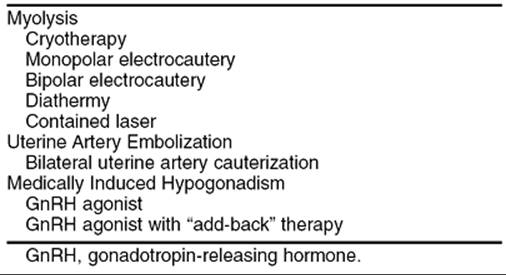 When removing fibroids is not appropriate, either because of patient choice or when confounding medical problems exist, a nonextirpative approach should be taken. A variety of options exist (Table 49.5) including medical suppression, in situ destruction of the myomas, or depriving them of their vascular supply. These approaches all suffer because long-term data are lacking and because the fibroids themselves, although regressed, are not removed. However, with the onset of menopause, the tumors can be anticipated to regress spontaneously, so a temporizing measure may suffice to relieve symptoms permanently.