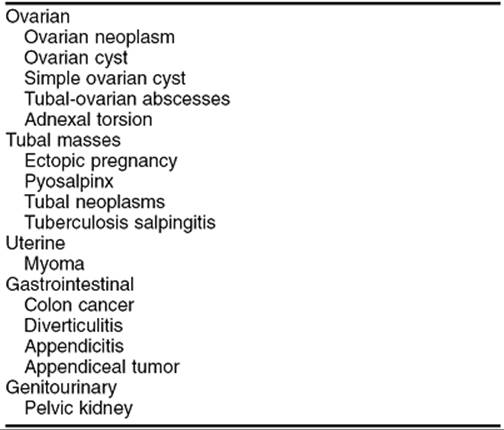Adnexal mass refers not only to ovarian abnormalities but to masses originating in the fallopian tube, ovary, broad ligament, bowel, as well as uterine masses that lateralize (Table 56.1). Taking a pertinent history is, therefore, important. In addition to ascertaining the quality, severity, and duration of abdominal symptoms, review of menstrual cycle characteristics in premenopausal women, history of pelvic infectious disease, and any gastrointestinal syndromes may guide the diagnosis to one area or another.