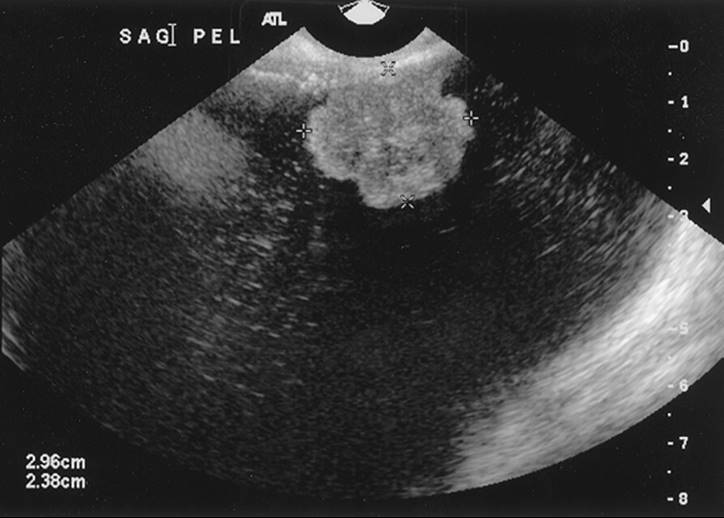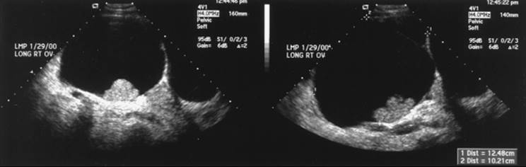 FIG. 56.2. Ultrasonographic image of an ovary with internal wall papillations. The final pathology of this ovarian cyst was clear cell adenocarcinoma. |