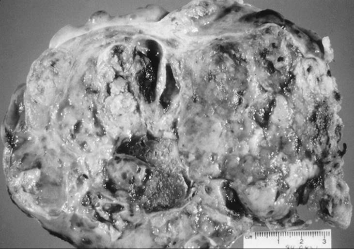 Adnexal masses in the young women may also be of germ cell origin. This is a special clinical scenario in that these neoplasms occur exclusively in young women. The main complaints include abdominal pain, with a pelvic mass found during examination. Some patients have acute abdominal pain resulting from torsion or rupture and hemorrhage of these masses. When evaluating a patient whose condition is not acute, the radiologic image usually reflects a solid mass with some cystic changes. The most common germ cell ovarian tumor is a dysgerminoma (Fig. 56.6). This is also the most common ovarian malignancy for young and pregnant women. This germ cell tumor is unusual in that it has a high incidence of bilaterality. Should a solid tumor be found and a germ cell tumor suspected, α-fetoprotein, human chorionic gonadotropin, and LBH levels may be drawn preoperatively, although none of these is necessarily predictive of finding a germ cell tumor. During surgery, given that most of these patients have not completed childbearing and that germ cells tumors most often are confined to the ovary, a conservative approach such as unilateral adnexectomy can be performed. Routine biopsy of the contralateral ovary in the case of a dysgerminoma is not recommended, even though the bilaterality rate is higher than with other germ cell tumors.