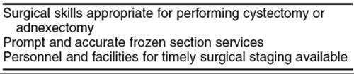 The role of laparoscopy in the management of the adnexal mass has advanced tremendously over the last decade. Laparoscopic technique has been developed and equipment is available such that laparoscopic surgery has never been easier. The advantages of a laparoscopic approach to management of the mass include shorter hospital stay, less pain, shorter recovery time, less expensive process by virtue of fewer days of hospitalization, and the potential to minimize the development of adhesions. Alternatively, the risks and complications of a laparoscopic approach differ from those associated with laparotomy. Although striking when reported and laparoscopic complications such as puncture of a vessel can be severe, altogether they are uncommon. Minimal requirements for a laparoscopic approach to the adnexal mass include adequate surgical skill to perform competently either a cystectomy or adnexectomy, accurate and prompt frozen section services, and the availability of staging in a timely fashion should rupture or advanced disease be diagnosed (Table 56.6). With the laparoscopic approach, once the mass is removed frozen section is completed as usual. Should the mass be malignant, staging should be undertaken as usual, either laparoscopically if the surgeon is skilled or by proceeding to laparotomy. If rupture of the mass occurs and the frozen section confirms malignancy, in general it is recommended that staging be performed promptly. However, should there be spill of ovarian contents inadvertently or in the process of performing a cystectomy, although the stage is upgraded to stage Ic ovarian cancer, it is unclear that the prognosis is much worse; however, in many cases the patient would be committed to adjuvant chemotherapy.