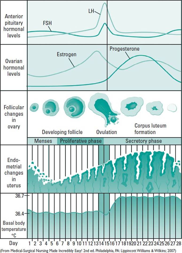• 1st day of vaginal bleeding = day 1 of cycle; mean duration of bleeding is 4 ± 2 d; avg bld loss of 35 mL. Mean cycle length 21–34 d (Clin Obstet Gynaecol 2010;2:157)